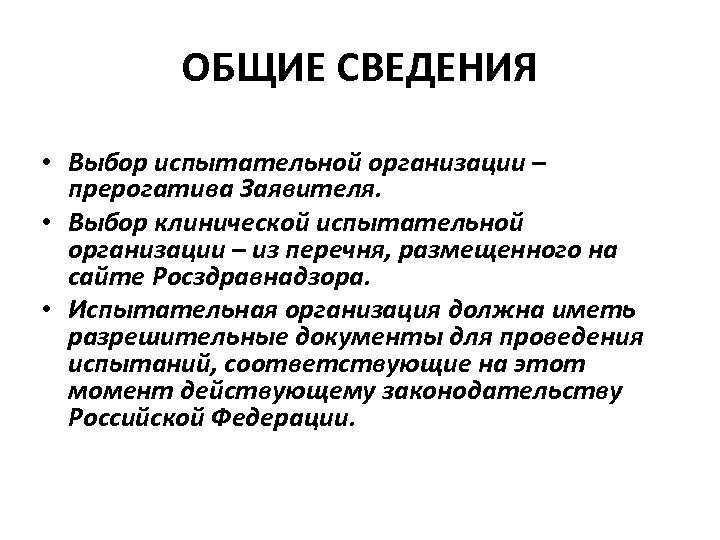 ОБЩИЕ СВЕДЕНИЯ • Выбор испытательной организации – прерогатива Заявителя. • Выбор клинической испытательной организации – из перечня, размещенного на сайте Росздравнадзора. • Испытательная организация должна иметь разрешительные документы для проведения испытаний, соответствующие на этот момент действующему законодательству Российской Федерации.