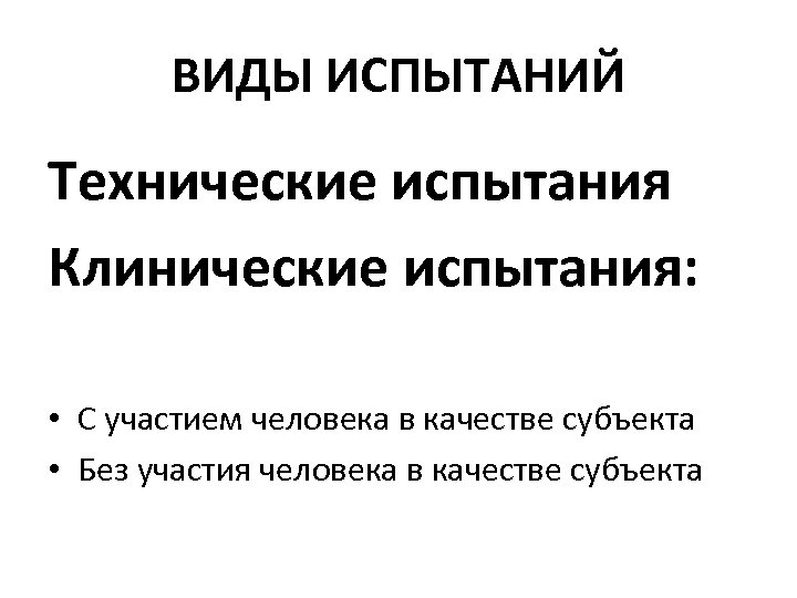 ВИДЫ ИСПЫТАНИЙ Технические испытания Клинические испытания: • С участием человека в качестве субъекта • Без участия человека в качестве субъекта