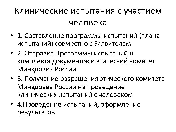 Клинические испытания с участием человека • 1. Составление программы испытаний (плана испытаний) совместно с Заявителем • 2. Отправка Программы испытаний и комплекта документов в этический комитет Минздрава России • 3. Получение разрешения этического комитета Минздрава России на проведение клинических испытаний с человеком • 4. Проведение испытаний, оформление результатов