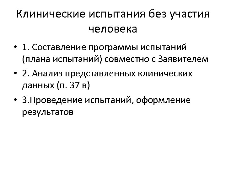 Клинические испытания без участия человека • 1. Составление программы испытаний (плана испытаний) совместно с Заявителем • 2. Анализ представленных клинических данных (п. 37 в) • 3. Проведение испытаний, оформление результатов