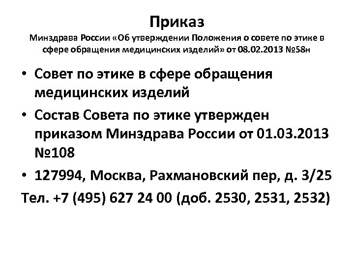Приказ Минздрава России «Об утверждении Положения о совете по этике в сфере обращения медицинских изделий» от 08. 02. 2013 № 58 н • Совет по этике в сфере обращения медицинских изделий • Состав Совета по этике утвержден приказом Минздрава России от 01. 03. 2013 № 108 • 127994, Москва, Рахмановский пер, д. 3/25 Тел. +7 (495) 627 24 00 (доб. 2530, 2531, 2532)