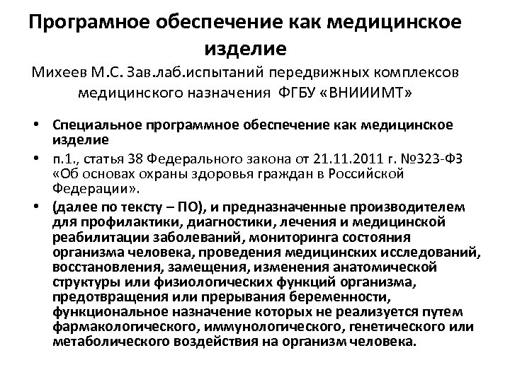Програмное обеспечение как медицинское изделие Михеев М. С. Зав. лаб. испытаний передвижных комплексов медицинского назначения ФГБУ «ВНИИИМТ» • Специальное программное обеспечение как медицинское изделие • п. 1. , статья 38 Федерального закона от 21. 11. 2011 г. № 323 -ФЗ «Об основах охраны здоровья граждан в Российской Федерации» . • (далее по тексту – ПО), и предназначенные производителем для профилактики, диагностики, лечения и медицинской реабилитации заболеваний, мониторинга состояния организма человека, проведения медицинских исследований, восстановления, замещения, изменения анатомической структуры или физиологических функций организма, предотвращения или прерывания беременности, функциональное назначение которых не реализуется путем фармакологического, иммунологического, генетического или метаболического воздействия на организм человека.