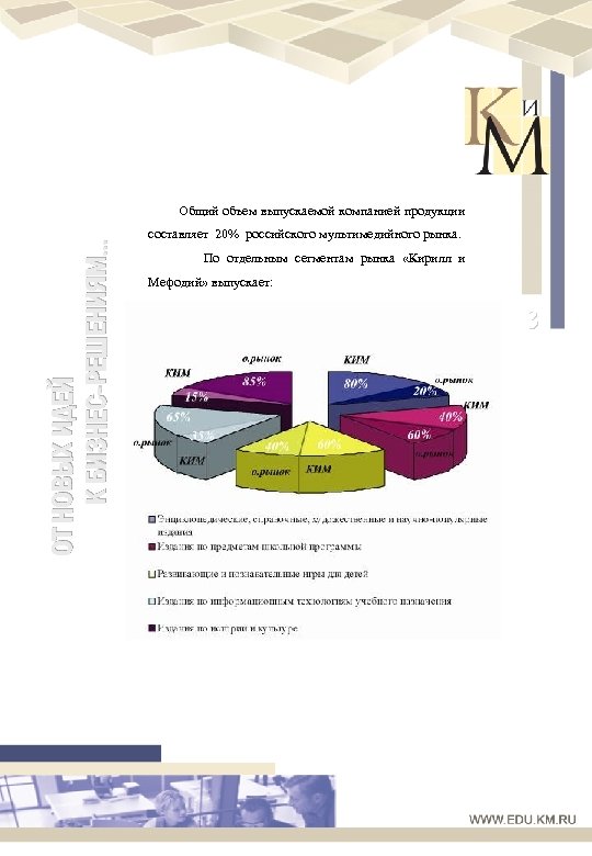 ОТ НОВЫХ ИДЕЙ К БИЗНЕС-РЕШЕНИЯМ… Общий объем выпускаемой компанией продукции составляет 20% российского мультимедийного рынка. По отдельным сегментам рынка «Кирилл и Мефодий» выпускает: 3