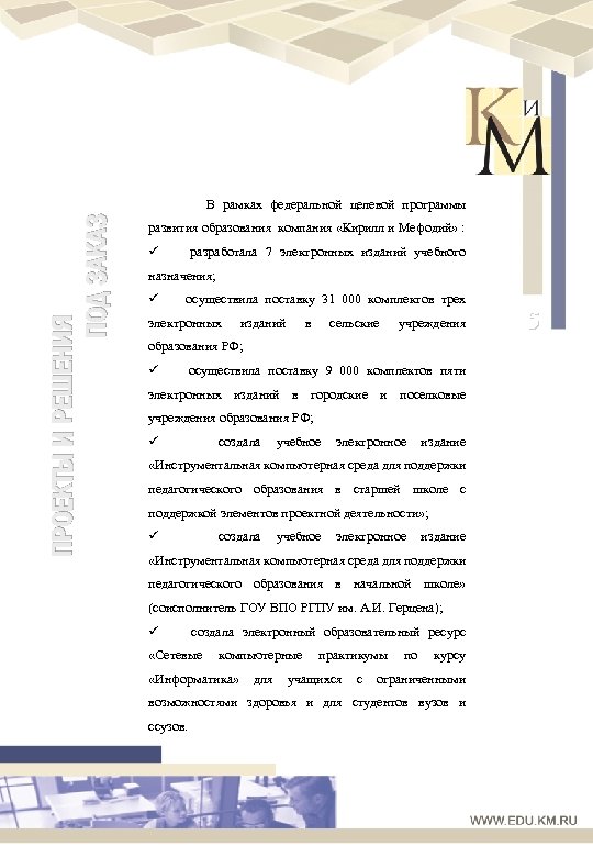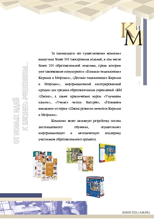 За одиннадцать лет существования компания ОТ НОВЫХ ИДЕЙ К БИЗНЕС-РЕШЕНИЯМ… выпустила более 300 электронных изданий, в том числе более 200 образовательной тематики, среди которых уже завоевавшие популярность «Большая энциклопедия Кирилла и Мефодия» , «Детская энциклопедия Кирилла и Мефодия» , информационный интегрированный продукт для средних образовательных учреждений «КМ -Школа» , а также практические курсы «Улучшаем память» , «Учимся читать быстрее» , «Развиваем внимание» из серии «Школа развития личности Кирилла и Мефодия» . Компания ведет активную разработку систем дистанционного информационную обучения, и методическую участников образовательного процесса. осуществляет поддержку 4