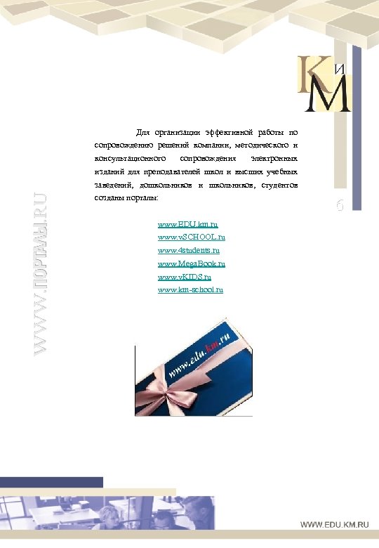 Для организации эффективной работы по сопровождению решений компании, методического и консультационного сопровождения электронных изданий для преподавателей школ и высших учебных WWW. ПОРТАЛЫ. RU заведений, дошкольников и школьников, студентов созданы порталы: www. EDU. km. ru www. v. SCHOOL. ru www. 4 students. ru www. Mega. Book. ru www. v. KIDS. ru www. km-school. ru 6