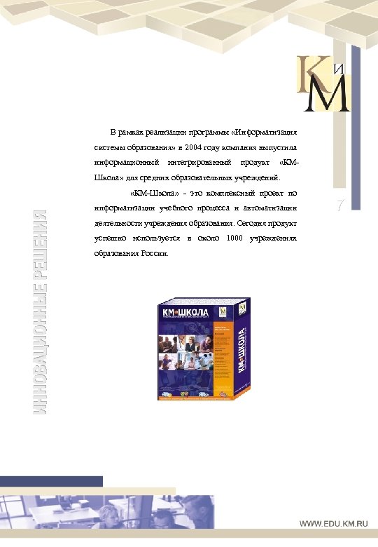 В рамках реализации программы «Информатизация системы образования» в 2004 году компания выпустила информационный интегрированный продукт «КМ- Школа» для средних образовательных учреждений. ИННОВАЦИОННЫЕ РЕШЕНИЯ «КМ-Школа» - это комплексный проект по информатизации учебного процесса и автоматизации деятельности учреждения образования. Сегодня продукт успешно используется в около 1000 учреждениях образования России. 7