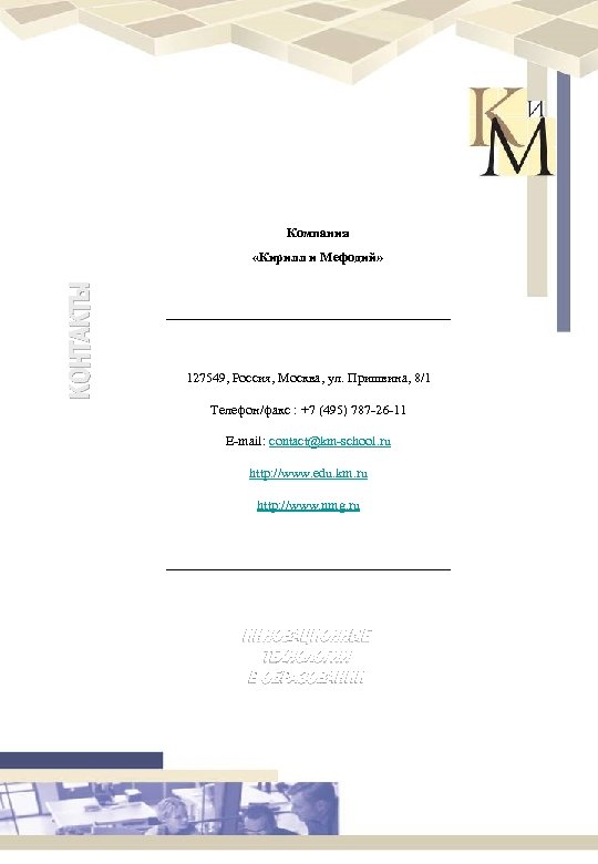 Компания КОНТАКТЫ «Кирилл и Мефодий» 127549, Россия, Москва, ул. Пришвина, 8/1 Телефон/факс : +7 (495) 787 -26 -11 E-mail: contact@km-school. ru http: //www. edu. km. ru http: //www. nmg. ru ИННОВАЦИОННЫЕ ТЕХНОЛОГИИ В ОБРАЗОВАНИИ