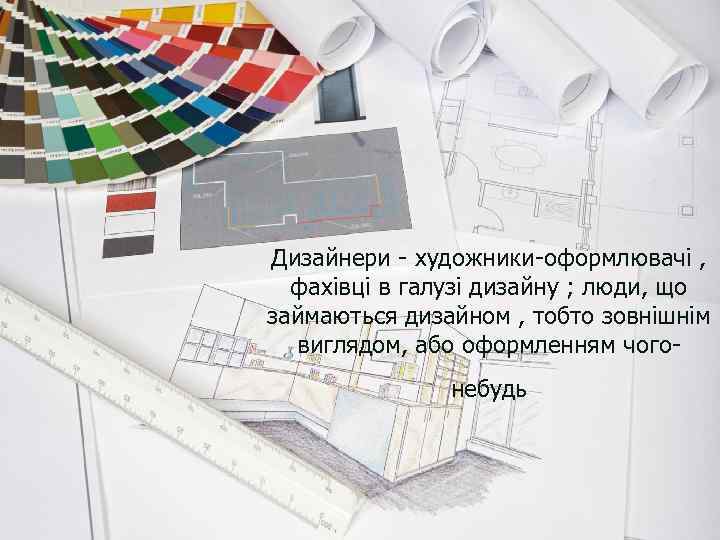 Дизайнери - художники-оформлювачі , фахівці в галузі дизайну ; люди, що займаються дизайном , тобто зовнішнім виглядом, або оформленням чогонебудь