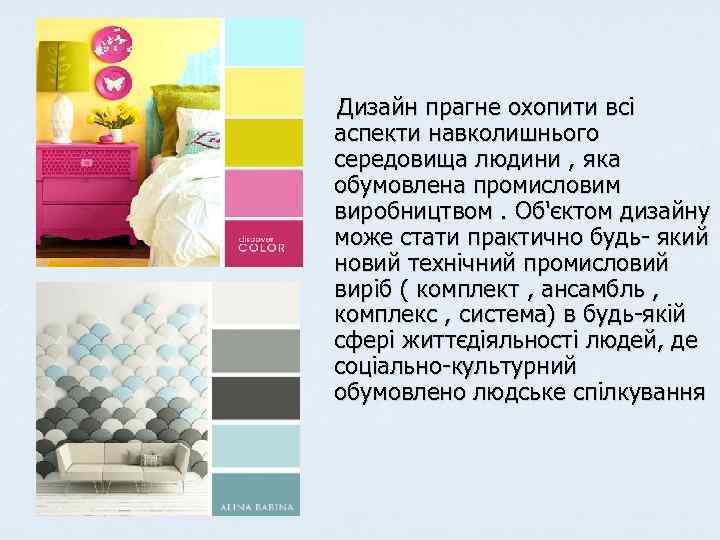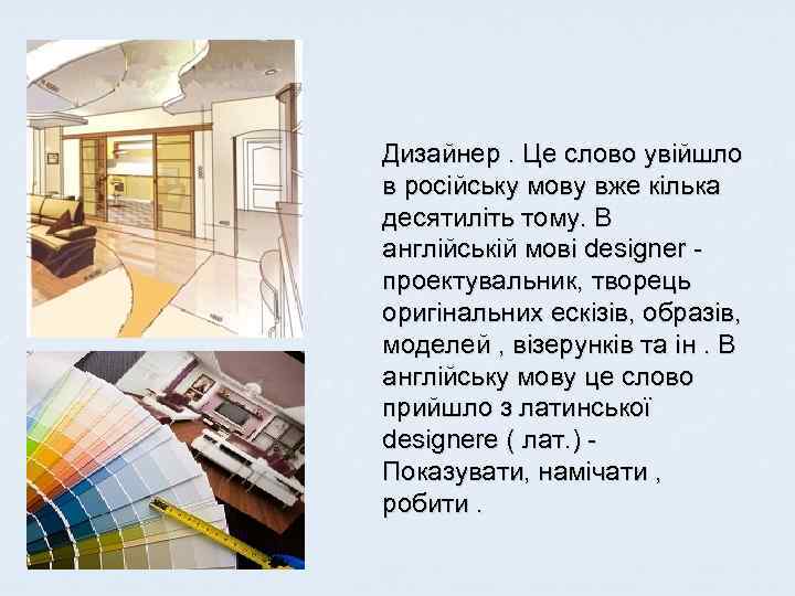 Дизайнер. Це слово увійшло в російську мову вже кілька десятиліть тому. В англійській мові designer проектувальник, творець оригінальних ескізів, образів, моделей , візерунків та ін. В англійську мову це слово прийшло з латинської designere ( лат. ) Показувати, намічати , робити.