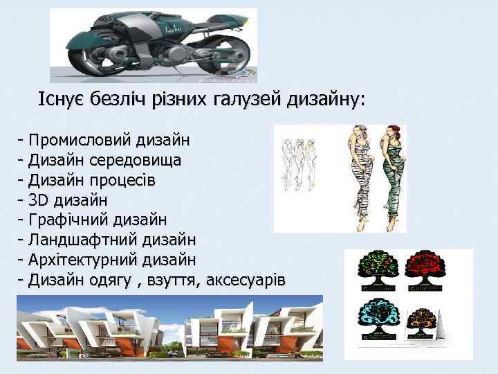 Існує безліч різних галузей дизайну: - Промисловий дизайн - Дизайн середовища - Дизайн процесів - 3 D дизайн - Графічний дизайн - Ландшафтний дизайн - Архітектурний дизайн - Дизайн одягу , взуття, аксесуарів