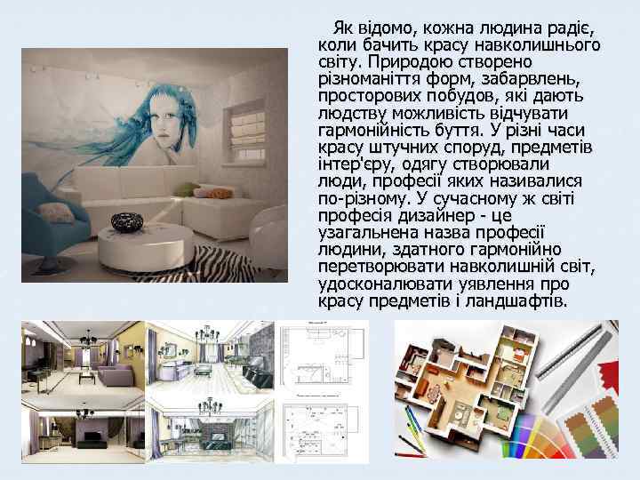 Як відомо, кожна людина радіє, коли бачить красу навколишнього світу. Природою створено різноманіття форм, забарвлень, просторових побудов, які дають людству можливість відчувати гармонійність буття. У різні часи красу штучних споруд, предметів інтер'єру, одягу створювали люди, професії яких називалися по-різному. У сучасному ж світі професія дизайнер - це узагальнена назва професії людини, здатного гармонійно перетворювати навколишній світ, удосконалювати уявлення про красу предметів і ландшафтів.
