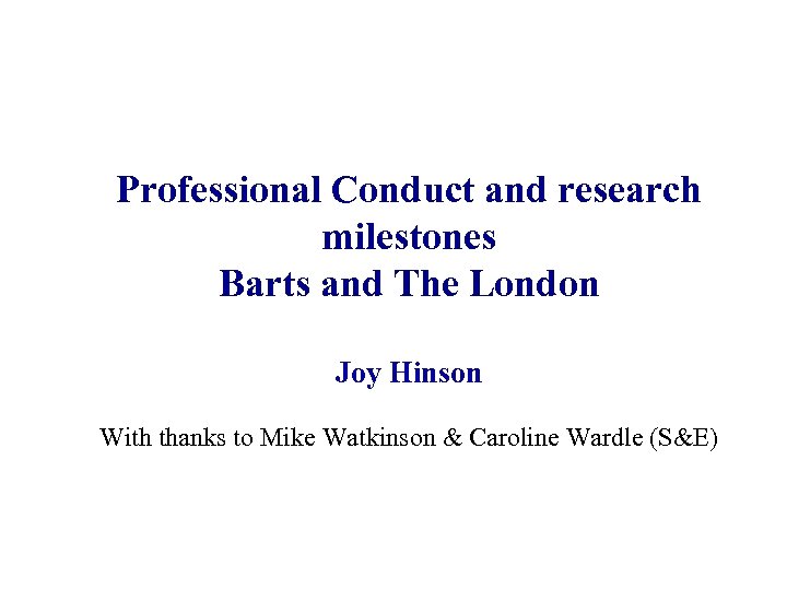 Professional Conduct and research milestones Barts and The London Joy Hinson With thanks to Mike Watkinson & Caroline Wardle (S&E)