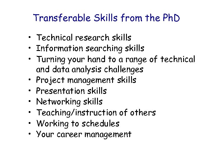 Transferable Skills from the Ph. D • Technical research skills • Information searching skills • Turning your hand to a range of technical and data analysis challenges • Project management skills • Presentation skills • Networking skills • Teaching/instruction of others • Working to schedules • Your career management