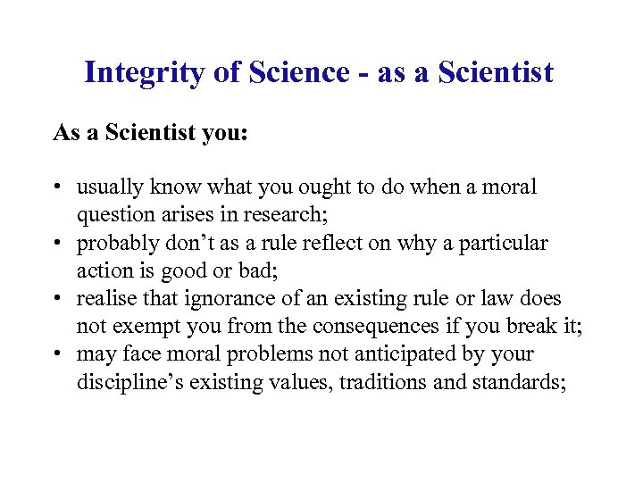 Integrity of Science - as a Scientist As a Scientist you: • usually know what you ought to do when a moral question arises in research; • probably don’t as a rule reflect on why a particular action is good or bad; • realise that ignorance of an existing rule or law does not exempt you from the consequences if you break it; • may face moral problems not anticipated by your discipline’s existing values, traditions and standards;