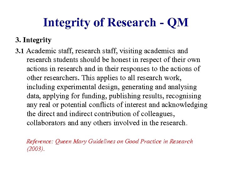 Integrity of Research - QM 3. Integrity 3. 1 Academic staff, research staff, visiting academics and research students should be honest in respect of their own actions in research and in their responses to the actions of other researchers. This applies to all research work, including experimental design, generating and analysing data, applying for funding, publishing results, recognising any real or potential conflicts of interest and acknowledging the direct and indirect contribution of colleagues, collaborators and any others involved in the research. Reference: Queen Mary Guidelines on Good Practice in Research (2003).