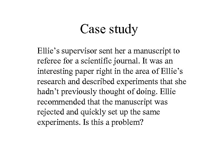 Case study Ellie’s supervisor sent her a manuscript to referee for a scientific journal. It was an interesting paper right in the area of Ellie’s research and described experiments that she hadn’t previously thought of doing. Ellie recommended that the manuscript was rejected and quickly set up the same experiments. Is this a problem?
