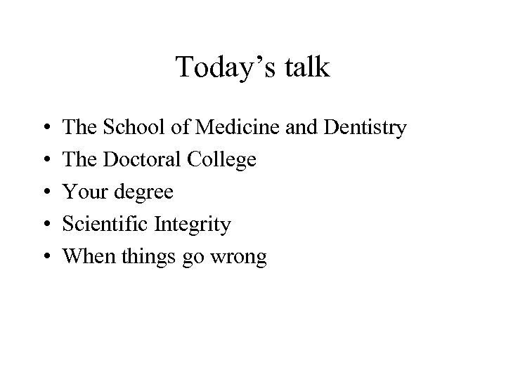 Today’s talk • • • The School of Medicine and Dentistry The Doctoral College Your degree Scientific Integrity When things go wrong