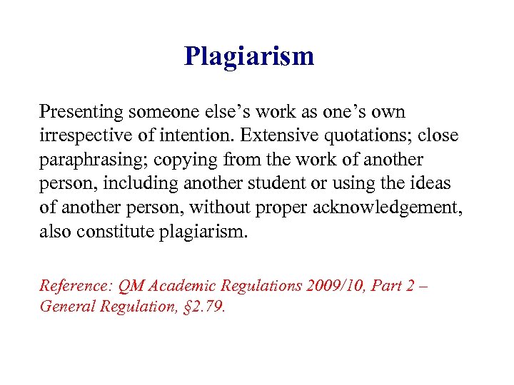 Plagiarism Presenting someone else’s work as one’s own irrespective of intention. Extensive quotations; close paraphrasing; copying from the work of another person, including another student or using the ideas of another person, without proper acknowledgement, also constitute plagiarism. Reference: QM Academic Regulations 2009/10, Part 2 – General Regulation, § 2. 79.