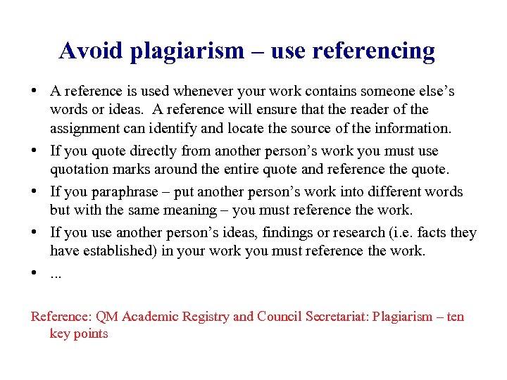 Avoid plagiarism – use referencing • A reference is used whenever your work contains someone else’s words or ideas. A reference will ensure that the reader of the assignment can identify and locate the source of the information. • If you quote directly from another person’s work you must use quotation marks around the entire quote and reference the quote. • If you paraphrase – put another person’s work into different words but with the same meaning – you must reference the work. • If you use another person’s ideas, findings or research (i. e. facts they have established) in your work you must reference the work. • . . . Reference: QM Academic Registry and Council Secretariat: Plagiarism – ten key points
