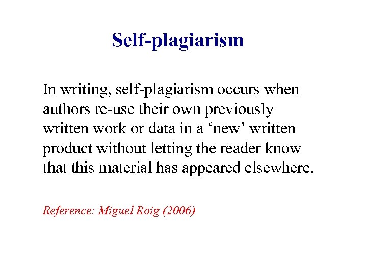 Self-plagiarism In writing, self-plagiarism occurs when authors re-use their own previously written work or data in a ‘new’ written product without letting the reader know that this material has appeared elsewhere. Reference: Miguel Roig (2006)