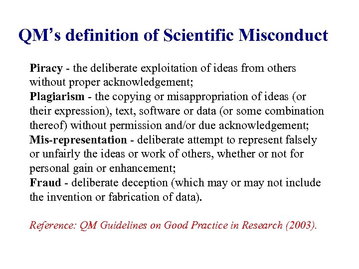 QM’s definition of Scientific Misconduct Piracy - the deliberate exploitation of ideas from others without proper acknowledgement; Plagiarism - the copying or misappropriation of ideas (or their expression), text, software or data (or some combination thereof) without permission and/or due acknowledgement; Mis-representation - deliberate attempt to represent falsely or unfairly the ideas or work of others, whether or not for personal gain or enhancement; Fraud - deliberate deception (which may or may not include the invention or fabrication of data). Reference: QM Guidelines on Good Practice in Research (2003).