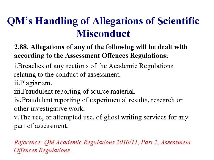 QM’s Handling of Allegations of Scientific Misconduct 2. 88. Allegations of any of the following will be dealt with according to the Assessment Offences Regulations; i. Breaches of any sections of the Academic Regulations relating to the conduct of assessment. ii. Plagiarism. iii. Fraudulent reporting of source material. iv. Fraudulent reporting of experimental results, research or other investigative work. v. The use, or attempted use, of ghost writing services for any part of assessment. Reference: QM Academic Regulations 2010/11, Part 2, Assessment Offences Regulations.