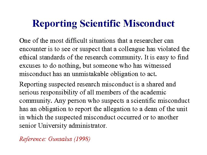 Reporting Scientific Misconduct One of the most difficult situations that a researcher can encounter is to see or suspect that a colleague has violated the ethical standards of the research community. It is easy to find excuses to do nothing, but someone who has witnessed misconduct has an unmistakable obligation to act. Reporting suspected research misconduct is a shared and serious responsibility of all members of the academic community. Any person who suspects a scientific misconduct has an obligation to report the allegation to a dean of the unit in which the suspected misconduct occurred or to another senior University administrator. Reference: Gunsalus (1998)