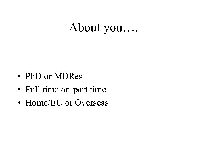 About you…. • Ph. D or MDRes • Full time or part time • Home/EU or Overseas