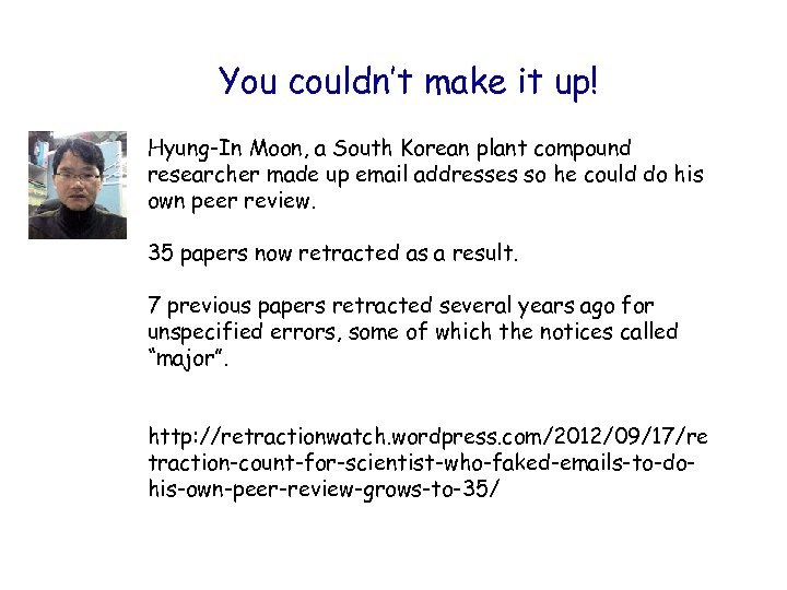You couldn’t make it up! Hyung-In Moon, a South Korean plant compound researcher made up email addresses so he could do his own peer review. 35 papers now retracted as a result. 7 previous papers retracted several years ago for unspecified errors, some of which the notices called “major”. http: //retractionwatch. wordpress. com/2012/09/17/re traction-count-for-scientist-who-faked-emails-to-dohis-own-peer-review-grows-to-35/