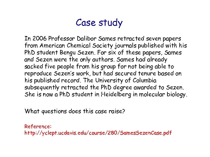 Case study In 2006 Professor Dalibor Sames retracted seven papers from American Chemical Society journals published with his Ph. D student Bengu Sezen. For six of these papers, Sames and Sezen were the only authors. Sames had already sacked five people from his group for not being able to reproduce Sezen’s work, but had secured tenure based on his published record. The University of Columbia subsequently retracted the Ph. D degree awarded to Sezen. She is now a Ph. D student in Heidelberg in molecular biology. What questions does this case raise? Reference: http: //yclept. ucdavis. edu/course/280/Sames. Sezen. Case. pdf