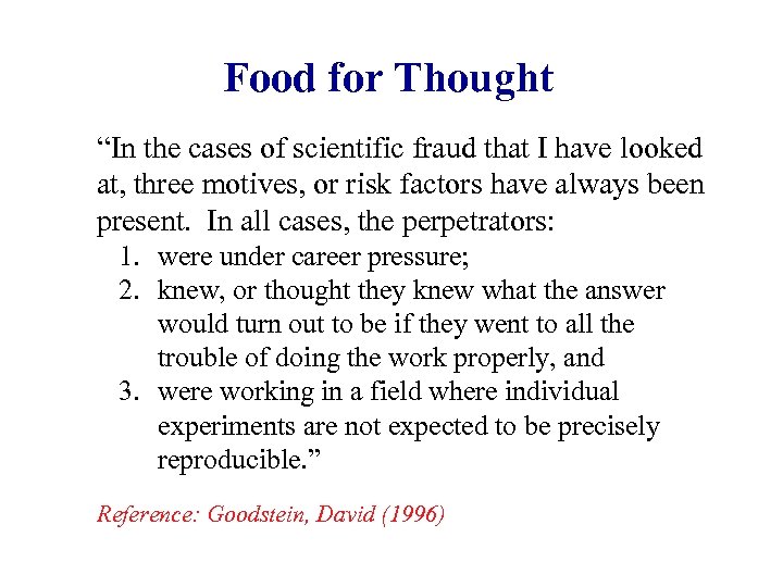 Food for Thought “In the cases of scientific fraud that I have looked at, three motives, or risk factors have always been present. In all cases, the perpetrators: 1. were under career pressure; 2. knew, or thought they knew what the answer would turn out to be if they went to all the trouble of doing the work properly, and 3. were working in a field where individual experiments are not expected to be precisely reproducible. ” Reference: Goodstein, David (1996)