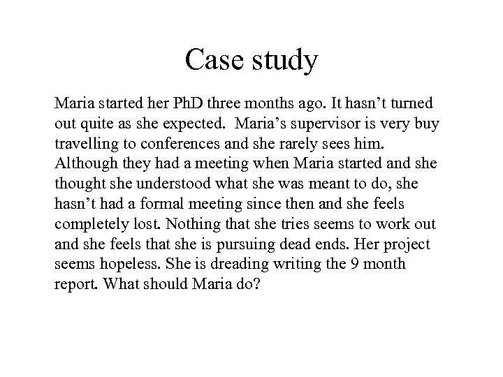 Case study Maria started her Ph. D three months ago. It hasn’t turned out quite as she expected. Maria’s supervisor is very buy travelling to conferences and she rarely sees him. Although they had a meeting when Maria started and she thought she understood what she was meant to do, she hasn’t had a formal meeting since then and she feels completely lost. Nothing that she tries seems to work out and she feels that she is pursuing dead ends. Her project seems hopeless. She is dreading writing the 9 month report. What should Maria do?