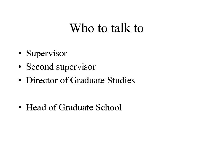Who to talk to • Supervisor • Second supervisor • Director of Graduate Studies • Head of Graduate School