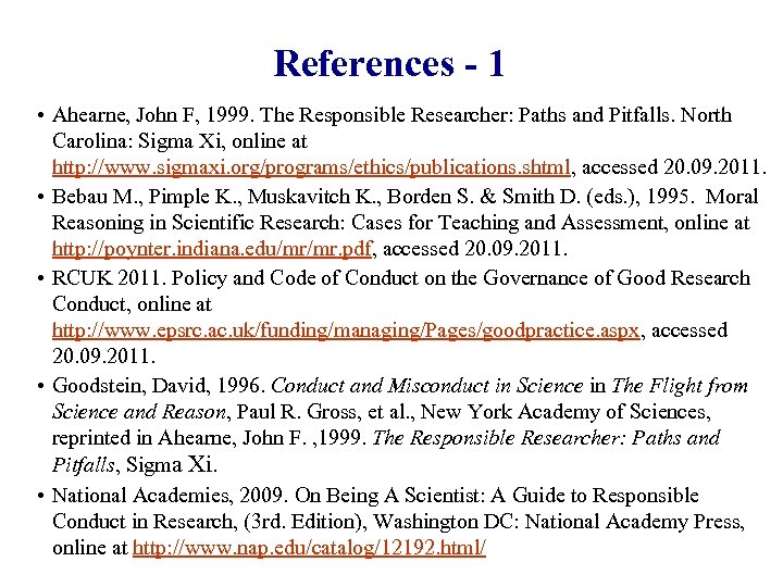 References - 1 • Ahearne, John F, 1999. The Responsible Researcher: Paths and Pitfalls. North Carolina: Sigma Xi, online at http: //www. sigmaxi. org/programs/ethics/publications. shtml, accessed 20. 09. 2011. • Bebau M. , Pimple K. , Muskavitch K. , Borden S. & Smith D. (eds. ), 1995. Moral Reasoning in Scientific Research: Cases for Teaching and Assessment, online at http: //poynter. indiana. edu/mr/mr. pdf, accessed 20. 09. 2011. • RCUK 2011. Policy and Code of Conduct on the Governance of Good Research Conduct, online at http: //www. epsrc. ac. uk/funding/managing/Pages/goodpractice. aspx, accessed 20. 09. 2011. • Goodstein, David, 1996. Conduct and Misconduct in Science in The Flight from Science and Reason, Paul R. Gross, et al. , New York Academy of Sciences, reprinted in Ahearne, John F. , 1999. The Responsible Researcher: Paths and Pitfalls, Sigma Xi. • National Academies, 2009. On Being A Scientist: A Guide to Responsible Conduct in Research, (3 rd. Edition), Washington DC: National Academy Press, online at http: //www. nap. edu/catalog/12192. html/