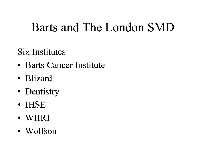 Barts and The London SMD Six Institutes • Barts Cancer Institute • Blizard • Dentistry • IHSE • WHRI • Wolfson