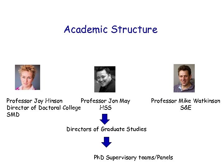 Academic Structure Professor Joy Hinson Professor Jon May Director of Doctoral College HSS SMD Professor Mike Watkinson S&E Directors of Graduate Studies Ph. D Supervisory teams/Panels