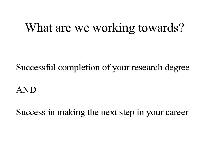 What are we working towards? Successful completion of your research degree AND Success in making the next step in your career
