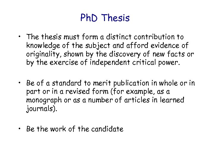 Ph. D Thesis • The thesis must form a distinct contribution to knowledge of the subject and afford evidence of originality, shown by the discovery of new facts or by the exercise of independent critical power. • Be of a standard to merit publication in whole or in part or in a revised form (for example, as a monograph or as a number of articles in learned journals). • Be the work of the candidate
