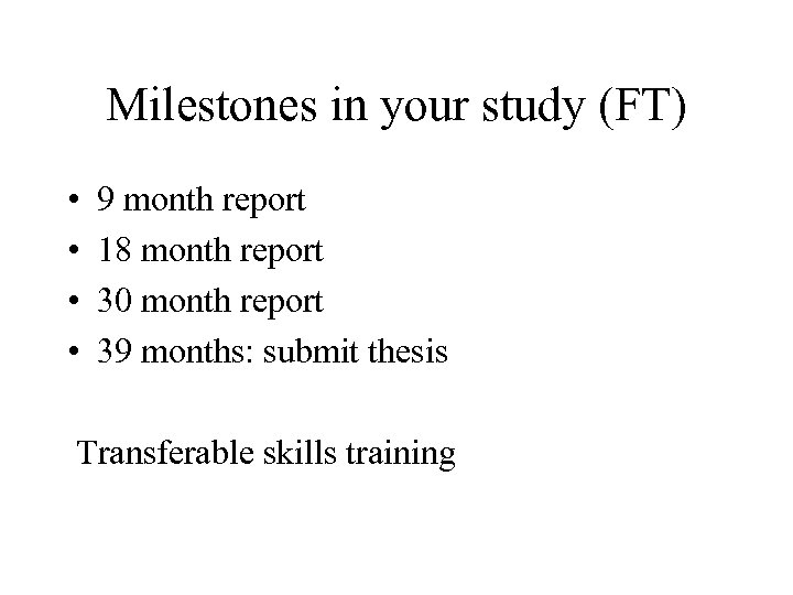 Milestones in your study (FT) • • 9 month report 18 month report 30 month report 39 months: submit thesis Transferable skills training
