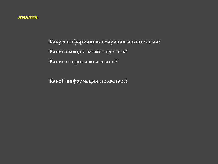 анализ Какую информацию получили из описания? Какие выводы можно сделать? Какие вопросы возникают? Какой информации не хватает?