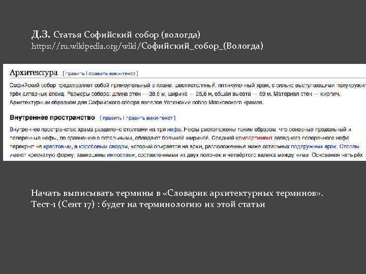 Д. З. Статья Софийский собор (вологда) https: //ru. wikipedia. org/wiki/Софийский_собор_(Вологда) Начать выписывать термины в «Словарик архитектурных терминов» . Тест-1 (Сент 17) : будет на терминологию их этой статьи