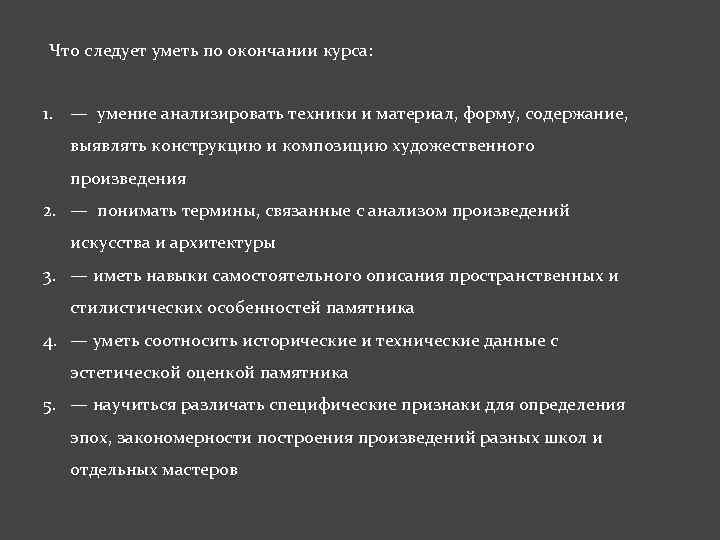 Что следует уметь по окончании курса: 1. — умение анализировать техники и материал, форму, содержание, выявлять конструкцию и композицию художественного произведения 2. — понимать термины, связанные с анализом произведений искусства и архитектуры 3. — иметь навыки самостоятельного описания пространственных и стилистических особенностей памятника 4. — уметь соотносить исторические и технические данные с эстетической оценкой памятника 5. — научиться различать специфические признаки для определения эпох, закономерности построения произведений разных школ и отдельных мастеров