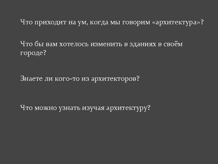 Что приходит на ум, когда мы говорим «архитектура» ? Что бы вам хотелось изменить в зданиях в своём городе? Знаете ли кого-то из архитекторов? Что можно узнать изучая архитектуру?
