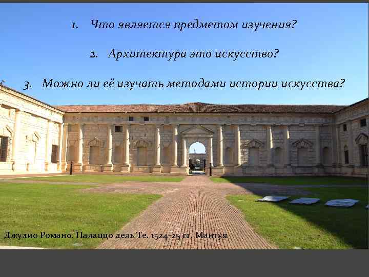 1. Что является предметом изучения? 2. Архитектура это искусство? 3. Можно ли её изучать методами истории искусства? Джулио Романо. Палаццо дель Те. 1524 -25 гг. Мантуя