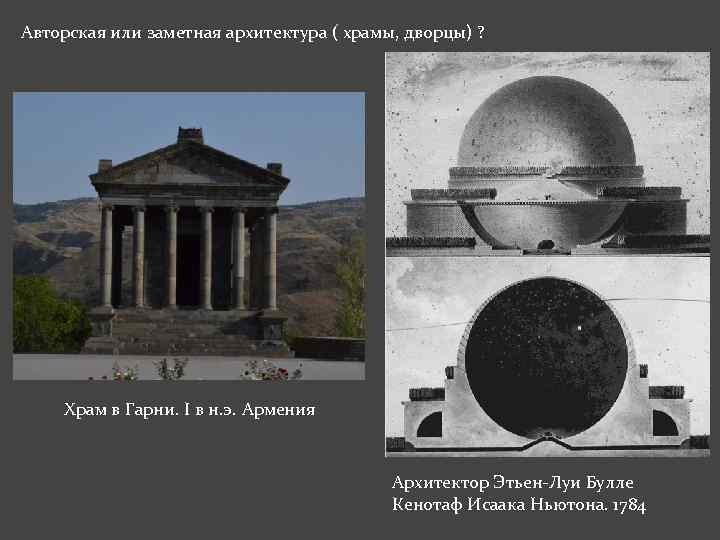 Авторская или заметная архитектура ( храмы, дворцы) ? Храм в Гарни. І в н. э. Армения Архитектор Этьен-Луи Булле Кенотаф Исаака Ньютона. 1784