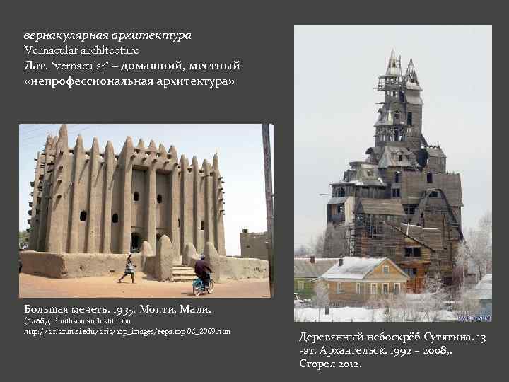 вернакулярная архитектура Vernacular architecture Лат. ‘vernacular’ – домашний, местный «непрофессиональная архитектура» Большая мечеть. 1935. Мопти, Мали. (слайд: Smithsonian Institution http: //sirismm. si. edu/siris/top_images/eepa. top. 06_2009. htm Деревянный небоскрёб Сутягина. 13 -эт. Архангельск. 1992 – 2008, . Сгорел 2012.