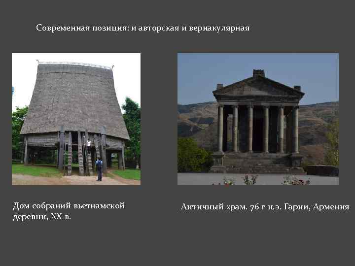 Современная позиция: и авторская и вернакулярная Дом собраний вьетнамской деревни, ХХ в. Античный храм. 76 г н. э. Гарни, Армения