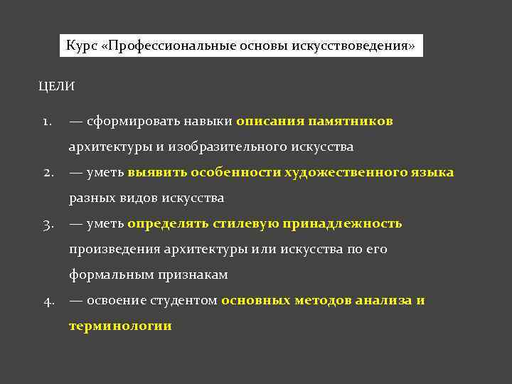 Курс «Профессиональные основы искусствоведения» ЦЕЛИ 1. — сформировать навыки описания памятников архитектуры и изобразительного искусства 2. — уметь выявить особенности художественного языка разных видов искусства 3. — уметь определять стилевую принадлежность произведения архитектуры или искусства по его формальным признакам 4. — освоение студентом основных методов анализа и терминологии