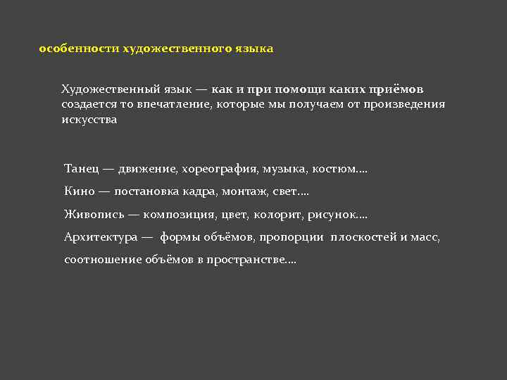 особенности художественного языка Художественный язык — как и при помощи каких приёмов создается то впечатление, которые мы получаем от произведения искусства Танец — движение, хореография, музыка, костюм…. Кино — постановка кадра, монтаж, свет…. Живопись — композиция, цвет, колорит, рисунок…. Архитектура — формы объёмов, пропорции плоскостей и масс, соотношение объёмов в пространстве….