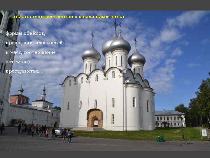анализ художественного языка памятника формы объёмов, пропорции плоскостей и масс, соотношение объёмов в пространстве….